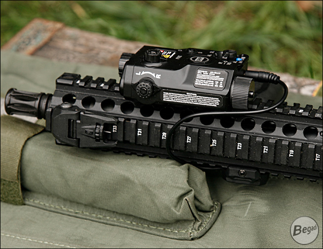 An der Vorderseite befinden sich zwei optische Ausgänge, darunter einer für den sichtbaren Laser und einer für den Infrarot-Laser. Zusätzlich gibt es eine markante, leicht herausragende Einheit für den Infrarot-Illuminator.