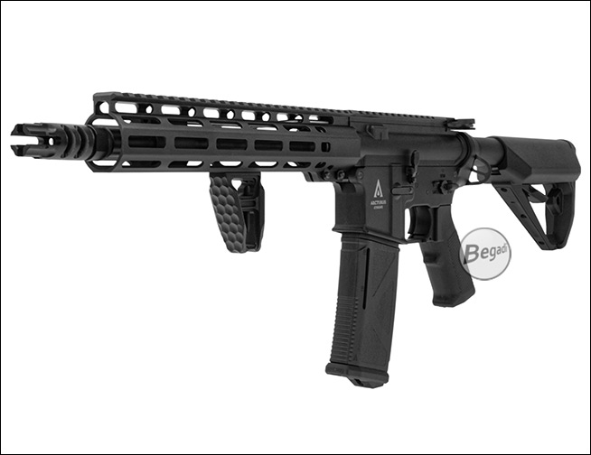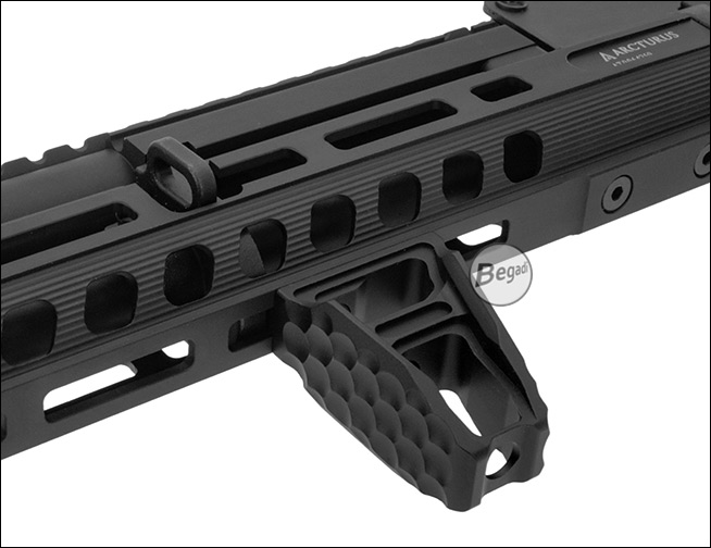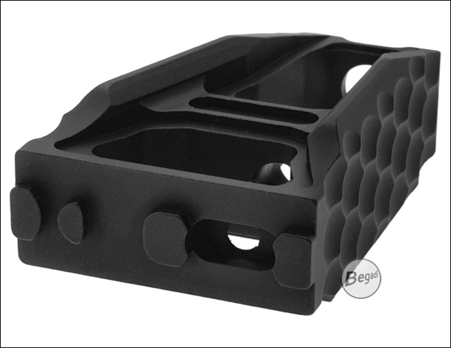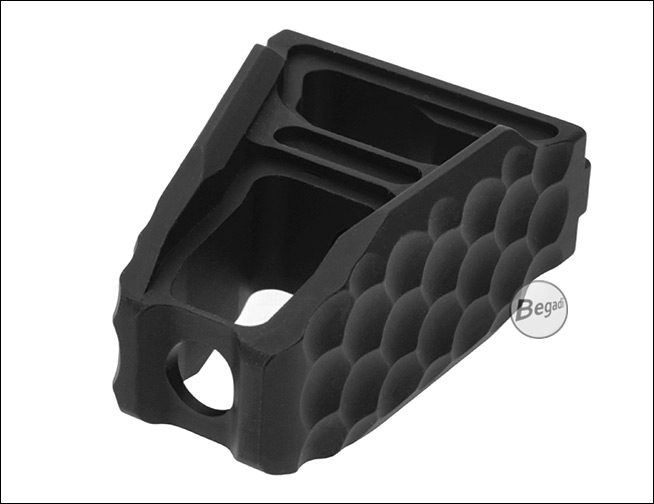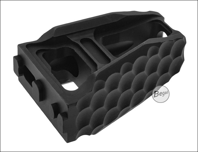 Dieser M-LOK Frontgriff aus Aluminium ist bewusst minimalistisch und offen gestaltet. Die skelettierte Bauweise reduziert das Gewicht an der Waffe spürbar, ohne dabei an Stabilität einzubüßen. Durch die leicht angewinkelte Form lässt er sich vielseitig einsetzen – klassisch als kompakter Frontgriff, als Handstop an Barrikaden oder zur Unterstützung bei einem C-Clamp-Griff.Die Vorderseite ist mit einem gefrästen Wabenmuster (Honeycomb-Struktur) versehen. Diese Textur sorgt für zuverlässigen Grip und eine sichere Handhabung, auch beim Tragen von Handschuhen oder bei schlechtem Wetter. Das matte Finish des Aluminiums fühlt sich wertig an und verhindert zudem störende Lichtreflexionen.