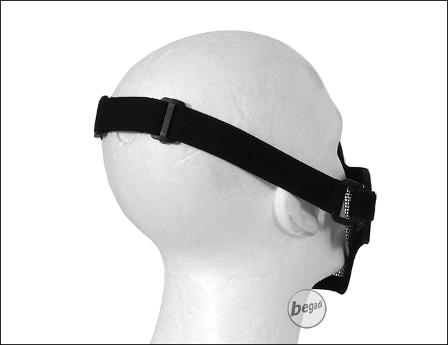 Ein stabiles, eloxiertes Drahtgeflecht schützt den Kiefer, Nase und einen Teil des Wangenbereich vor BBs. Das voll verstellbare elastische Kopfband lässt sich auf alle Größen anpassen und hält den Schutz sicher an seinem Platz.