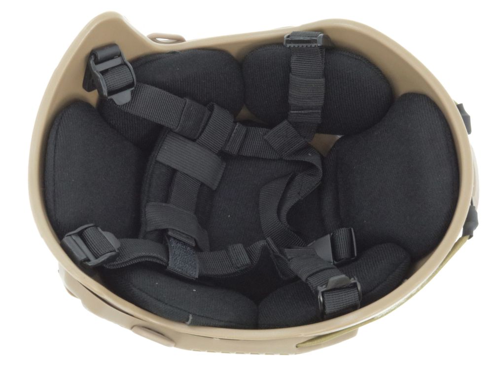 Der Airsoft Helm orientiert sich am MICH 2001 Style. Die Grundausstattung umfasst seitliche Rails und eine NVG Mount an der Front. Die Innenausstattung besteht aus einem 4-Punkte-Kinnriemensystem mit Nackensupport und per Klett austauschbaren Polstern.